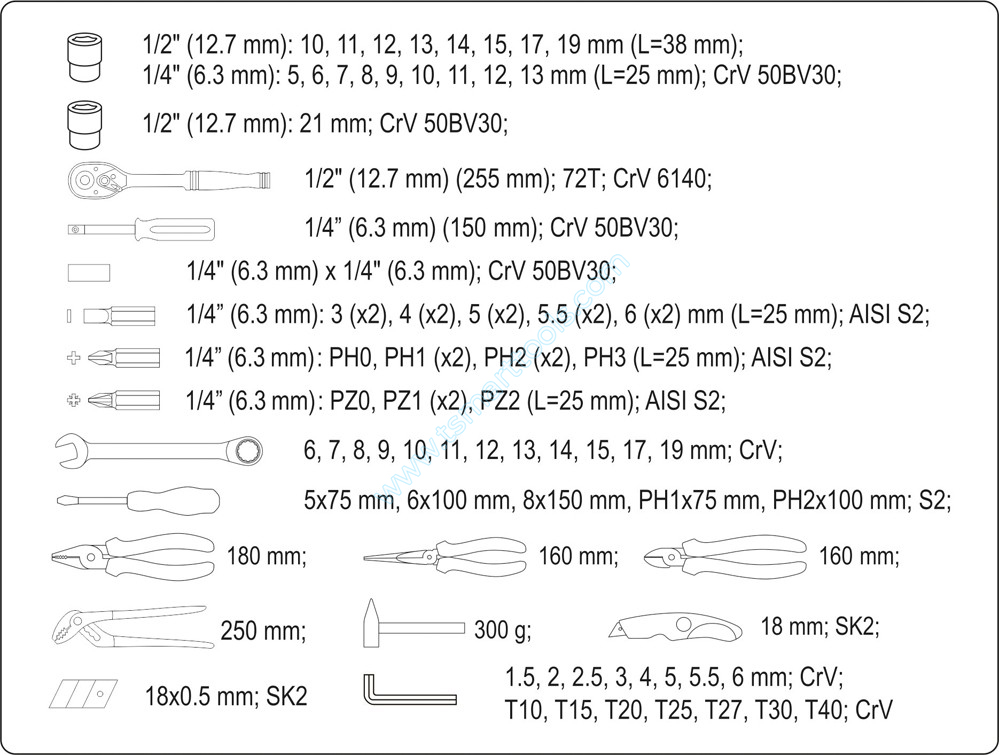 Bộ dụng cụ sửa chữa 80 chi tiết YATO YT-38951 có đầy đủ các chi tiết thông dụng nhất hiện nay như: các loại cờ lê mỏ lết, kìm kẹp các loại, đầu khẩu tay vặn, các loại tuốc nơ vít và đầu tuốc nơ vít, lục giác,dao rọc,búa, tay vặn khẩu.